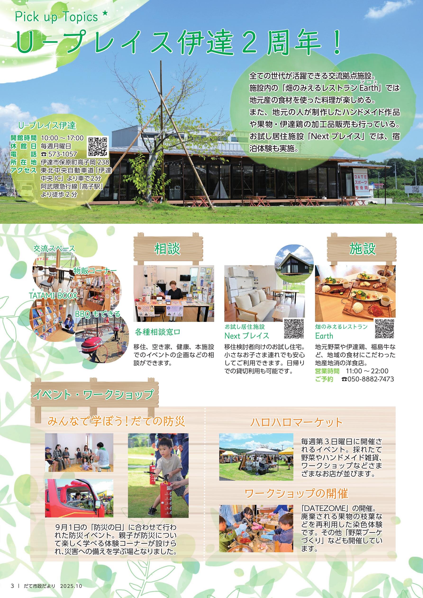 2 目次、人口と世帯 3 Pick up Topics ★ U −プレイス伊達2周年!