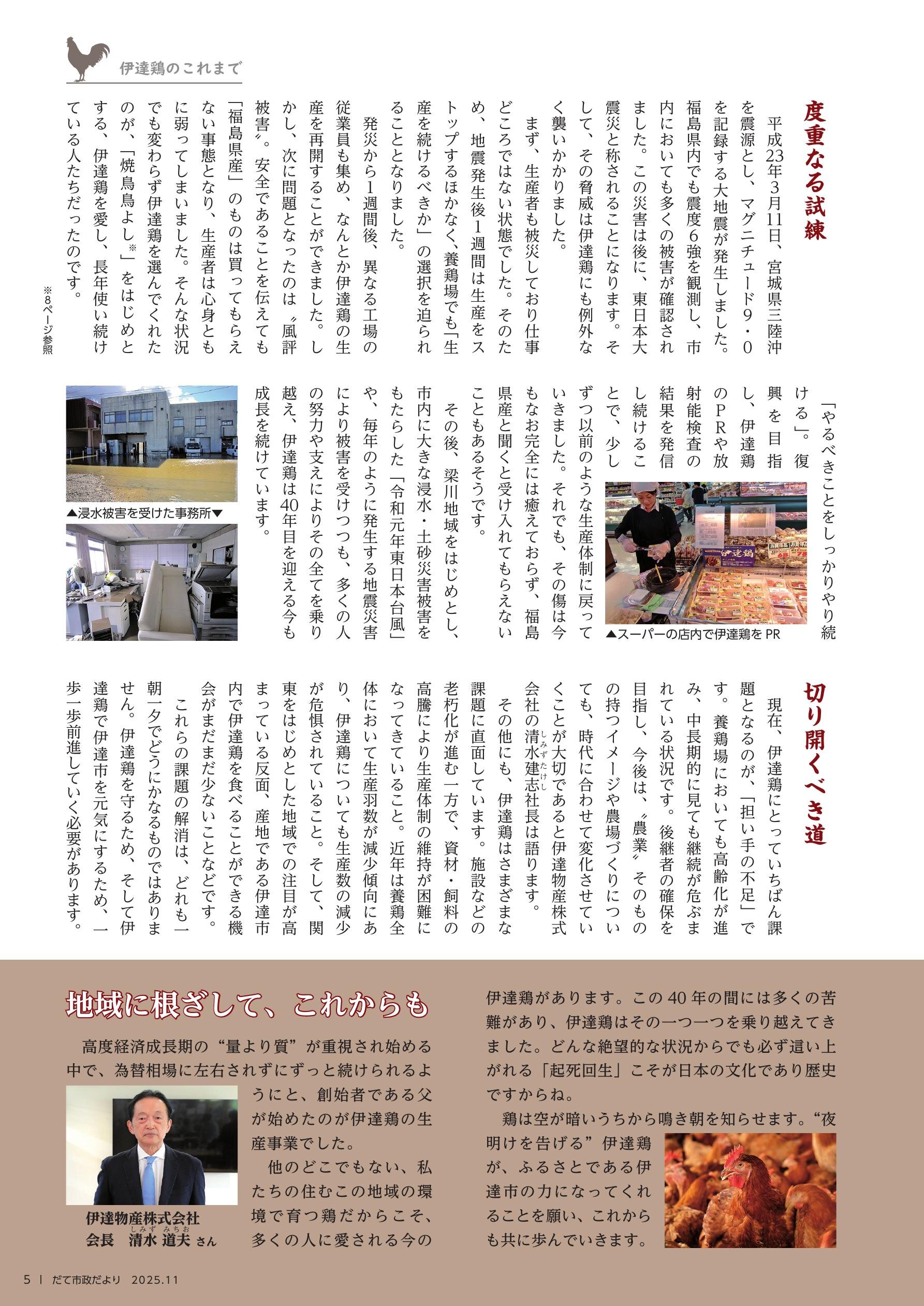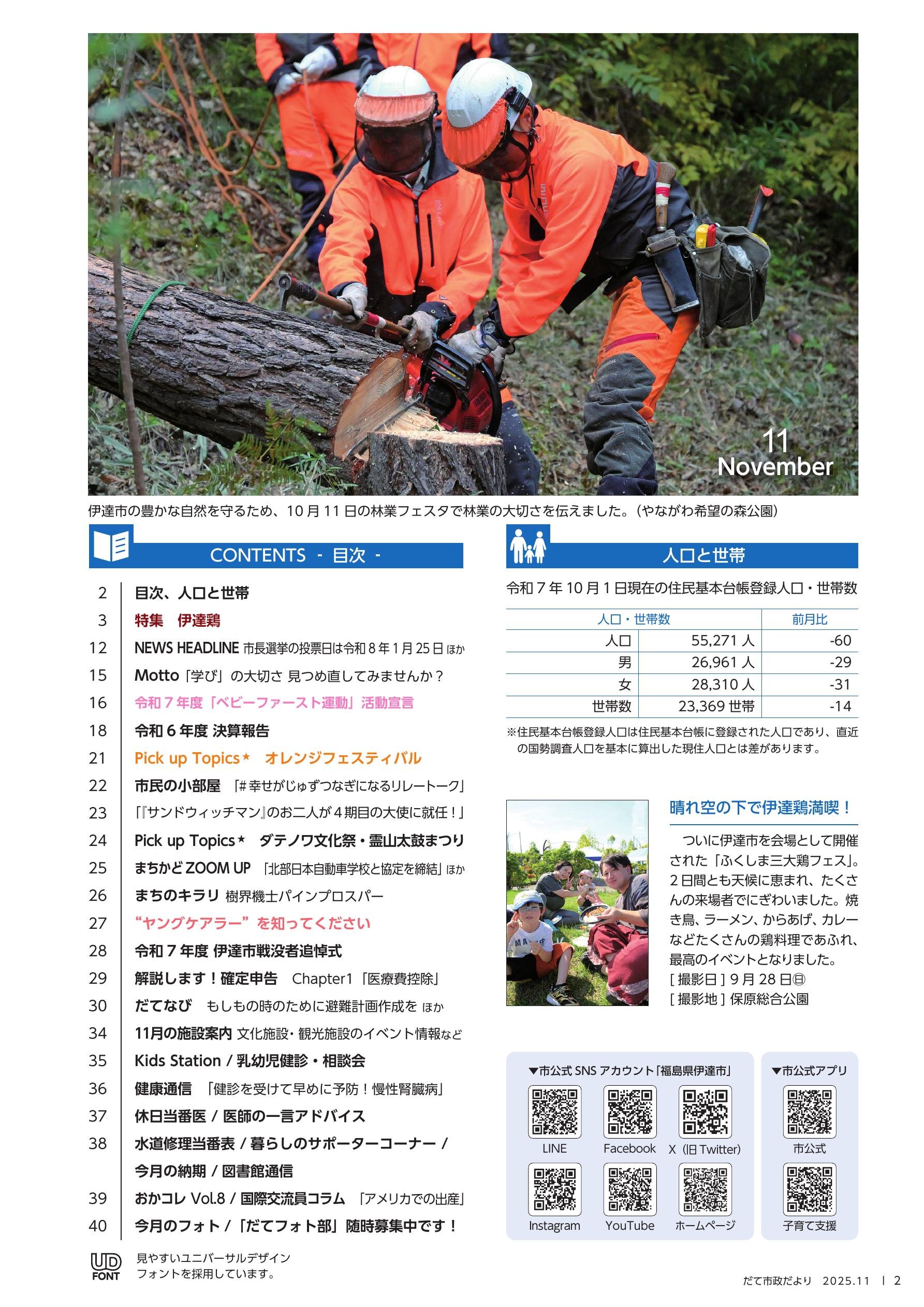 02 目次、人口と世帯 03 特集 伊達鶏 12 NEWS HEADLINE