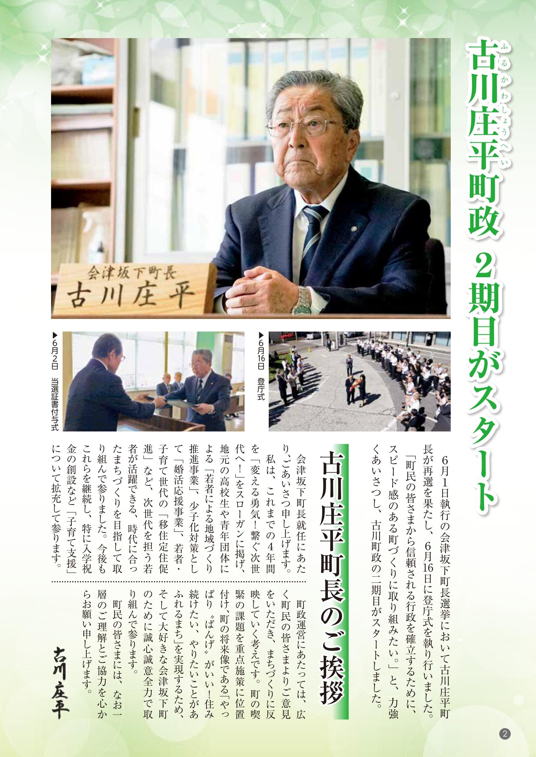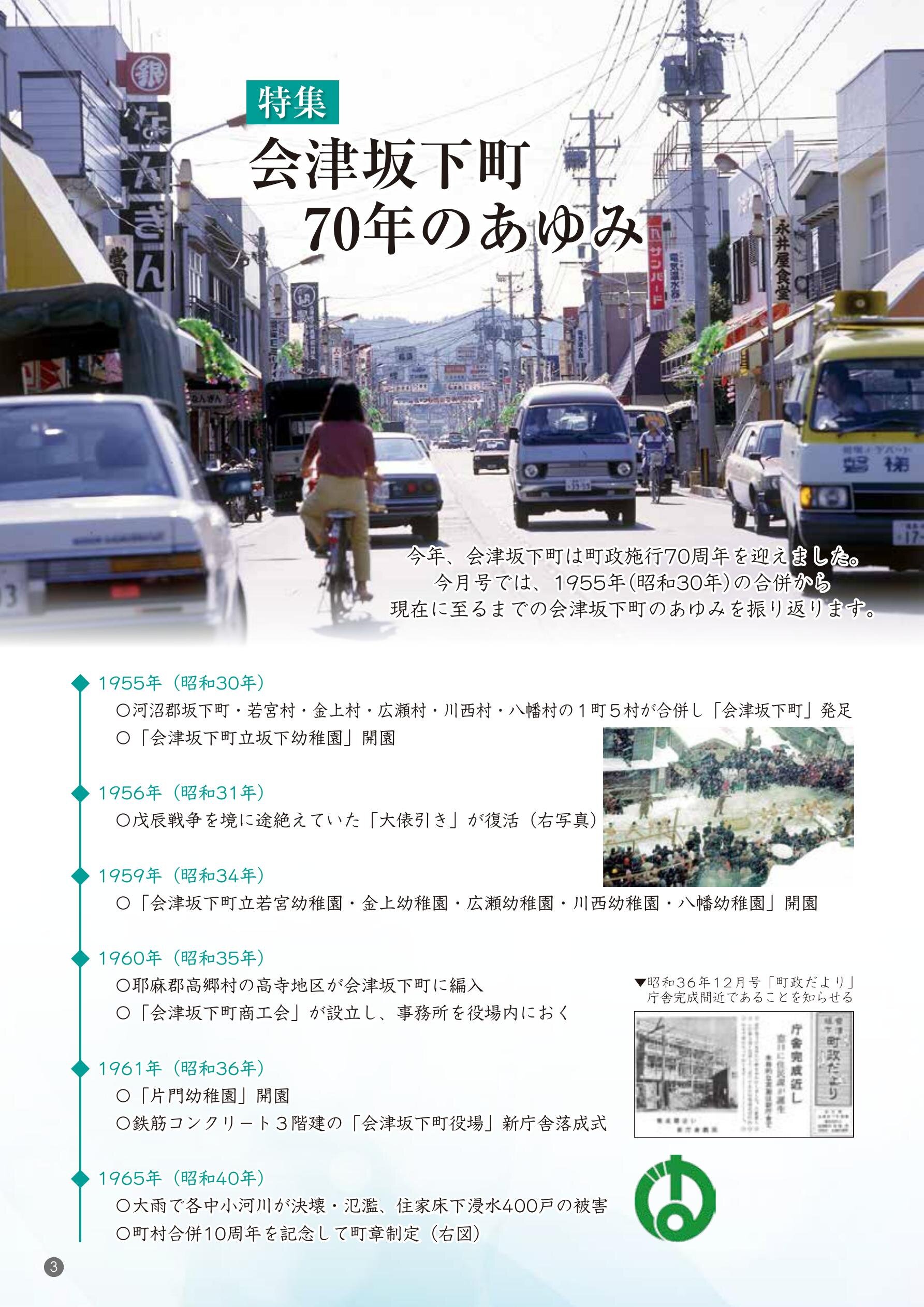 古川庄平町政2期目がスタート・・・2 【特集】会津坂下町70年のあゆみ・・・3 まちの話題・・・8 御田植祭のお知らせ・・・10