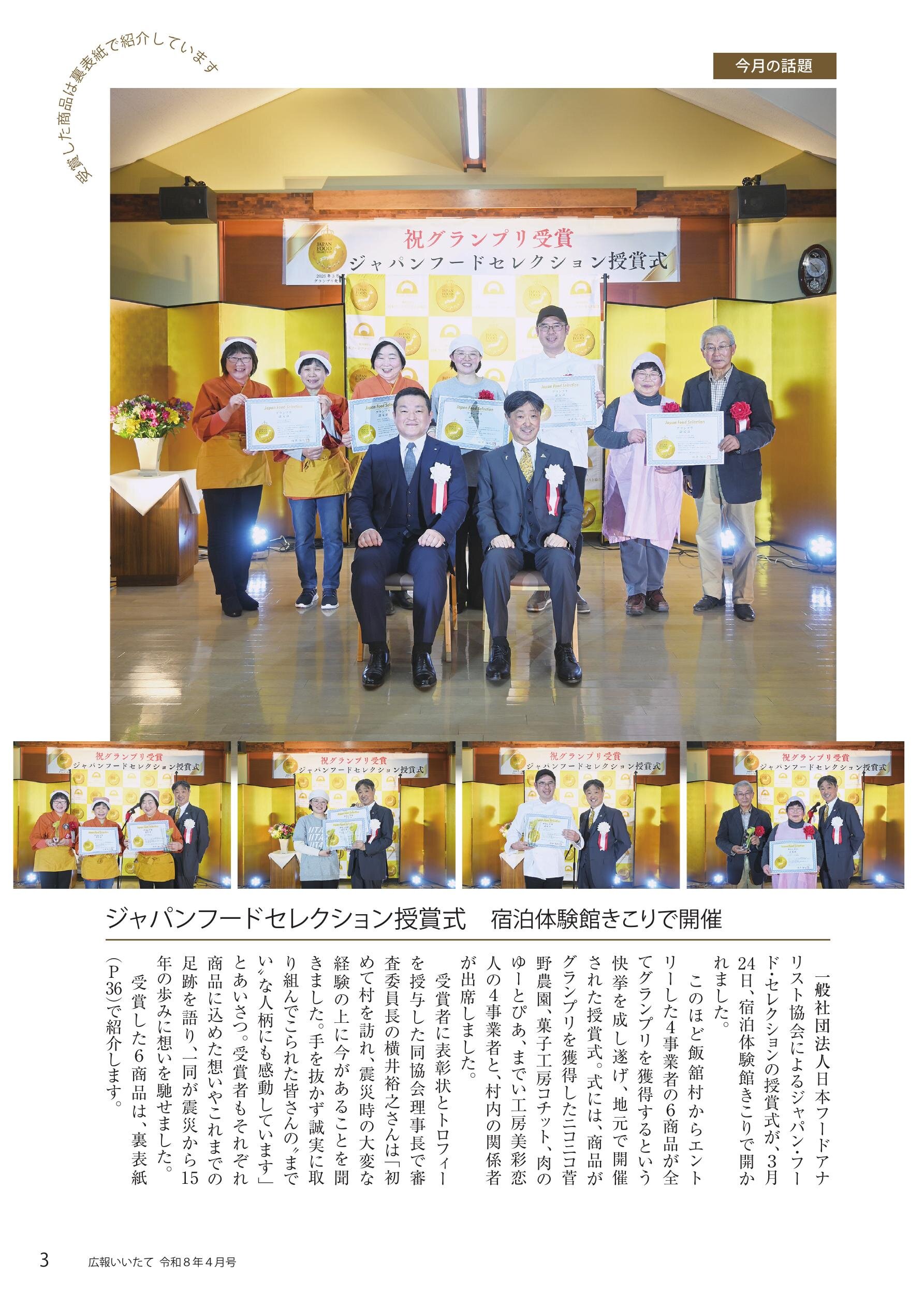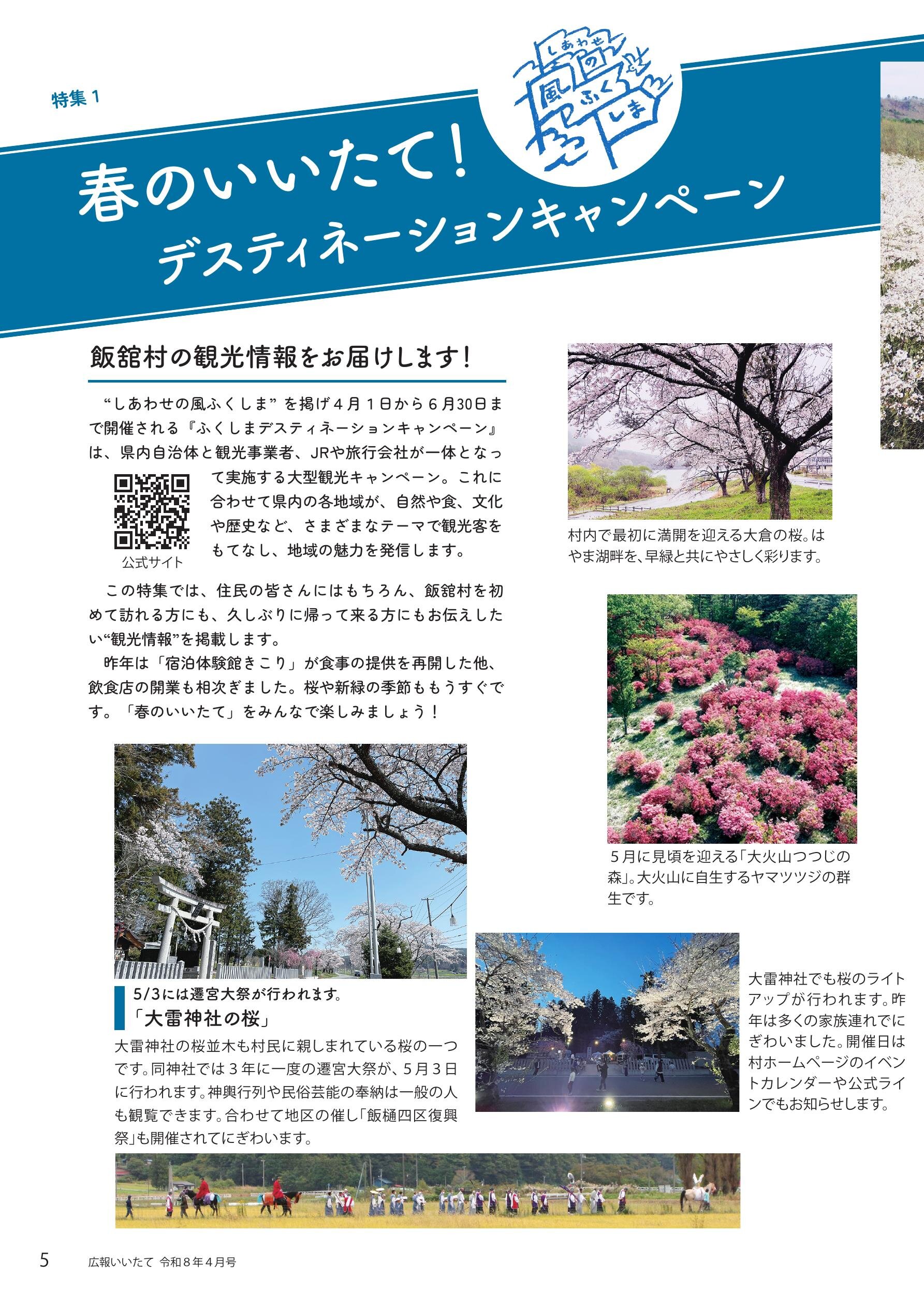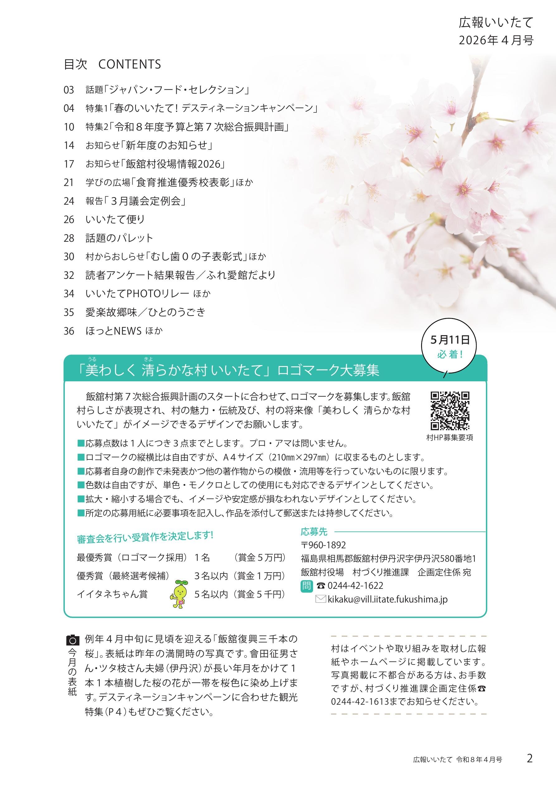 03 話題「ジャパン・フード・セレクション」 04 特集1「春のいいたて!デスティネーションキャンペーン」 10 特集2「令和8年度予算と第7次総合振興計画」