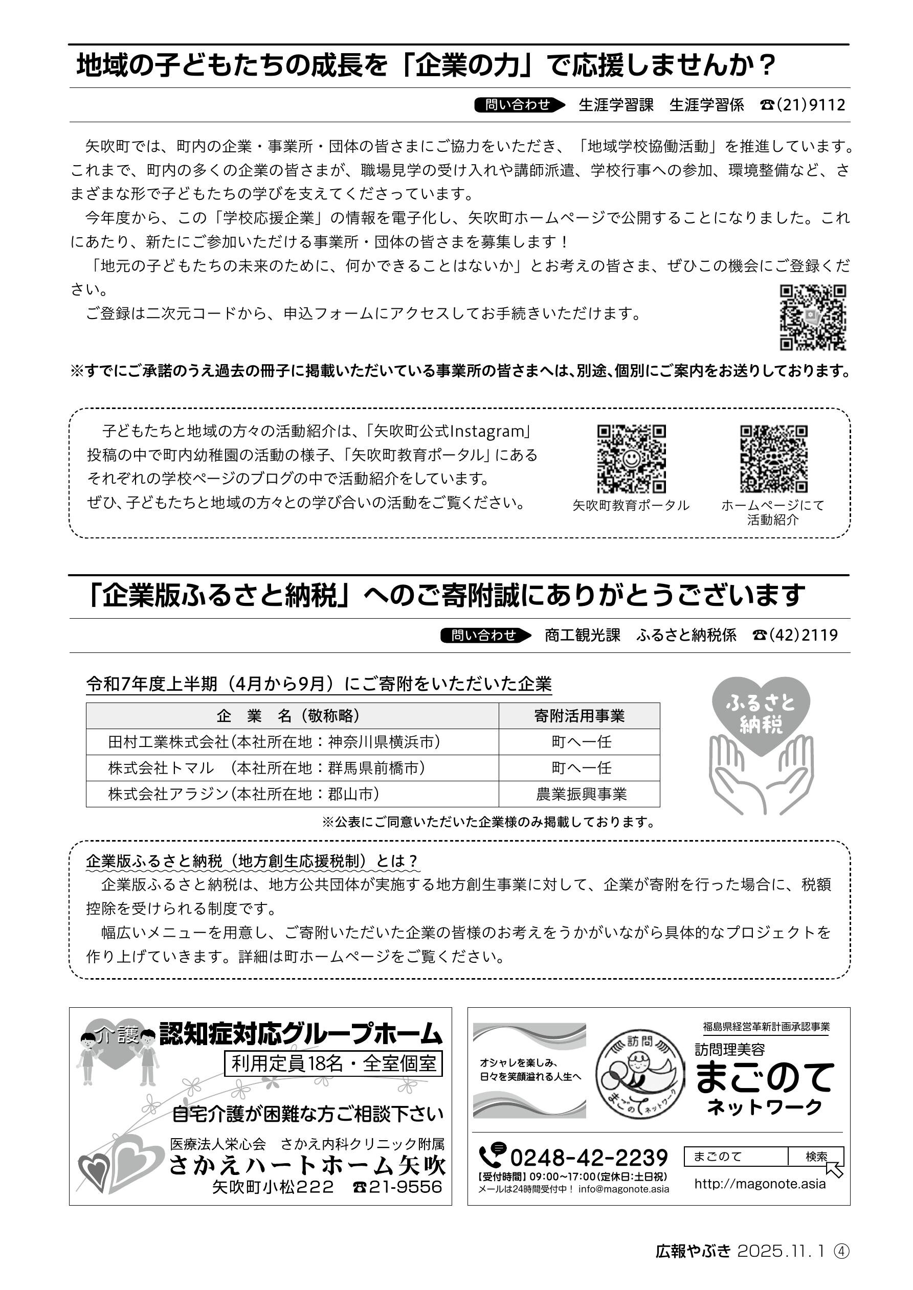 ◇ 矢吹町の財政状況をお知らせします・・・2 ◇ 地域の子どもたちの成長を企業で応援しませんか・・・4 ◇「 企業版ふるさと納税」へのご寄付誠にありがとうございます・・・4